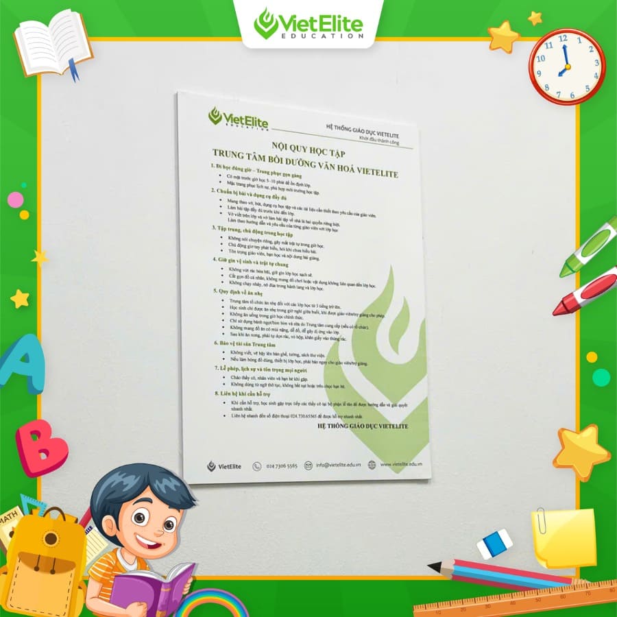 Thay vì những áp đặt khô khan, VietElite xây dựng nề nếp thông qua sự cam kết và hiểu biết. Ngay tại các lớp học, học sinh luôn được nhắc nhở về các chuẩn mực đạo đức và hành vi qua những bảng hướng dẫn trực quan.